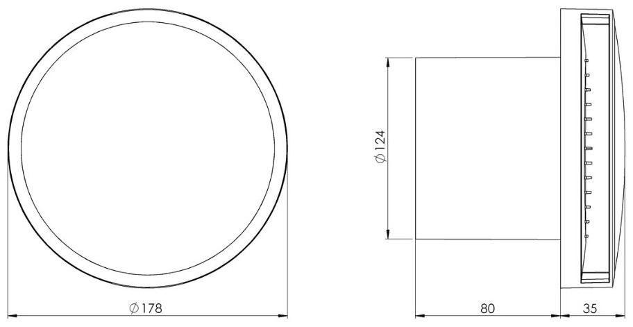 Диаметр патрубка 124 мм совместим с большинством стандартных воздуховодов 125 мм. В комплект входят лицевой фланец и крепёж. Подключение к сети 220 В. Доступны версии с таймером задержки, обратным клапаном и датчиком влажности.